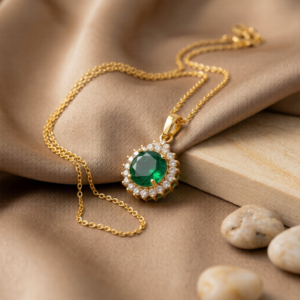 Add a touch of royal sophistication to your ensemble with this breathtaking Emerald Green Halo Necklace. Featuring a vibrant, round-cut emerald-toned centerpiece, the pendant is encircled by a shimmering sunburst halo of brilliant clear stones that capture the light from every angle.