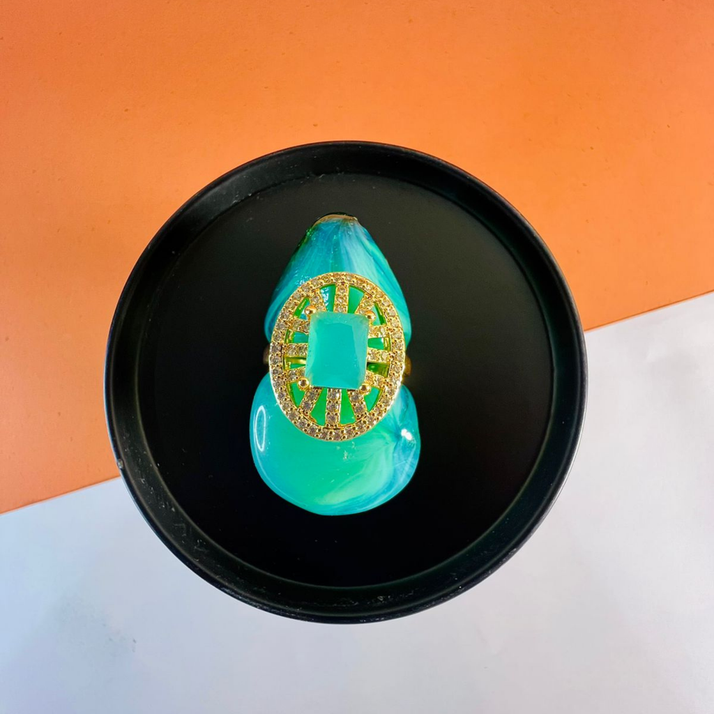 This Emerald Green Stone Adjustable Ring features a stunning rectangular green crystal centerpiece surrounded by a radiant halo of sparkling zircon stones. The intricate gold-plated frame adds a luxurious touch, creating a statement piece perfect for elevating any outfit.
